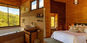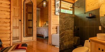 Our VIP Mountain Cabin is located at the top of the property featuring gorgeous views of the forest-covered mountains. This cabin is spacious and secluded for extra privacy. It features 1 king sized bed a private deck, a fireplace for cozy nights as well as a soaking tub with beautiful views.